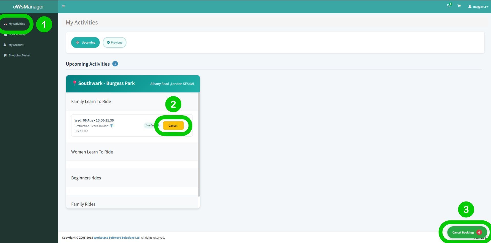 All of our rides and our learn-to-ride sessions are very popular. If you can't come to something you have booked, cancel by clicking on 'My Activities' in the bar on the left, select 'Cancel' on the activity you want to cancel and finally, click 'Cancel Bookings' on the bottom right.