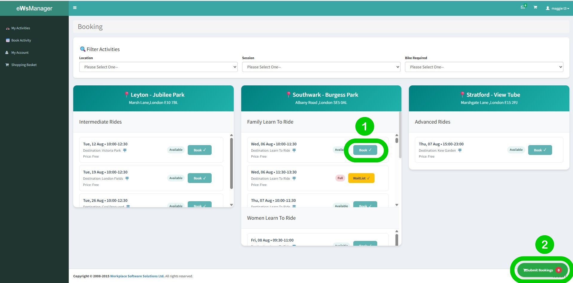 If the only option is 'Waitlist' this means that the session is fully booked and when you click 'Submit Bookings', you will be added to the waitlist.